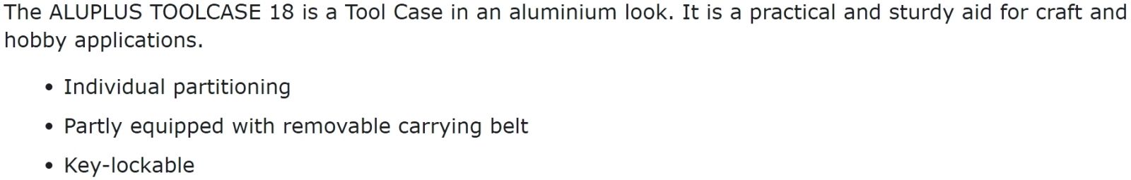 | 2223857 מזוודת אחסון מקצועית לכלי עבודה - ALLUPLUS TOOLCASE 18 | ALLEGRO MICROSYSTEMS | מזוודת אחסון מקצועית לכלי עבודה - ALLUPLUS TOOLCASE 18 ♦ גוף בנוי מאלומיניום איכותי עם פסי חיז... ארגזי כלים ופתרונות אחסון » ארגזי כלים , מזוודות טכנאים ותיקים לכלי עבודה | לא ניתן להזמין - אזל המלאי |