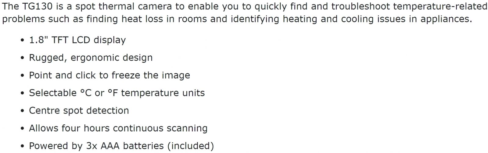 | 8721162 מצלמה תרמית - FLIR TG130 | FLIR SYSTEMS | מצלמה תרמית - FLIR TG130 ♦ מסך LCD TFT איכותי בגודל 1.8 אינץ'♦ טווח טמפרטורות : 10&o... ציוד בדיקה ומכשירי מדידה » מצלמות תרמיות | לא ניתן להזמין - אזל המלאי |