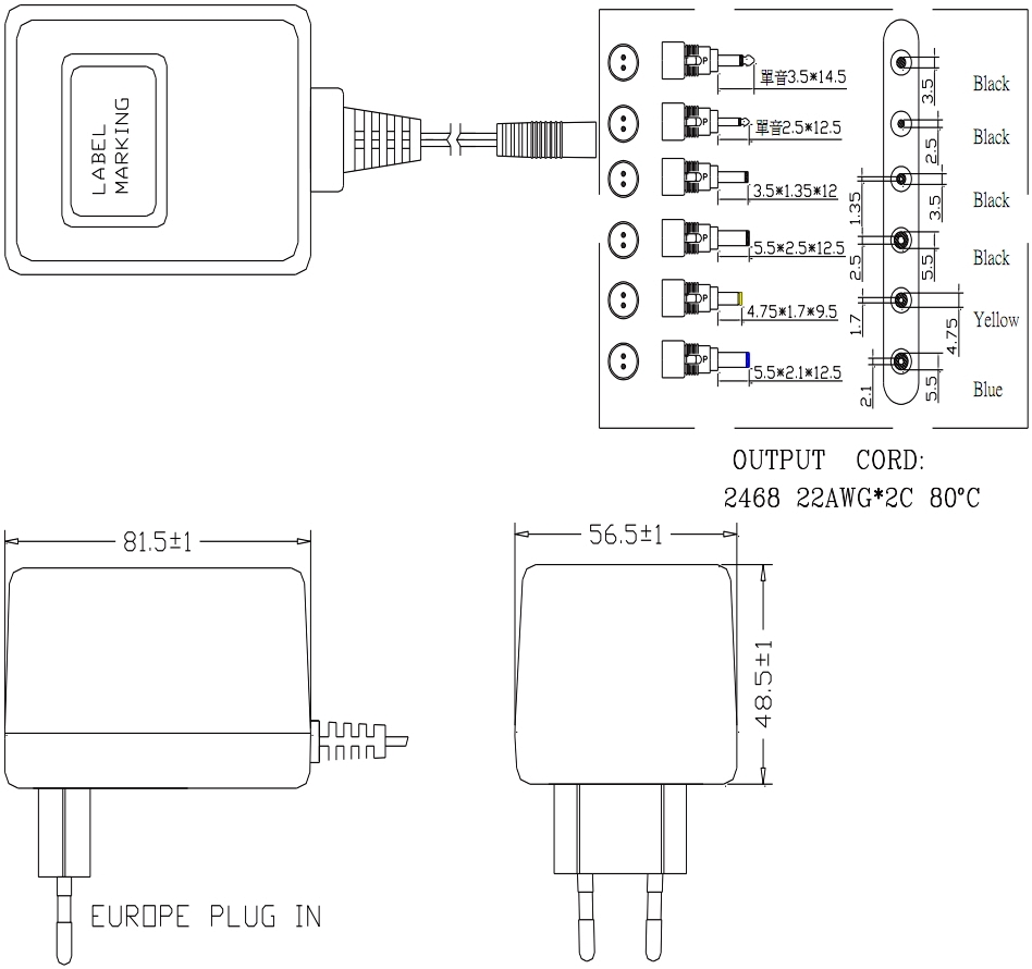 ♦ מסופק עם שישה תקעי DC בגדלים שונים
