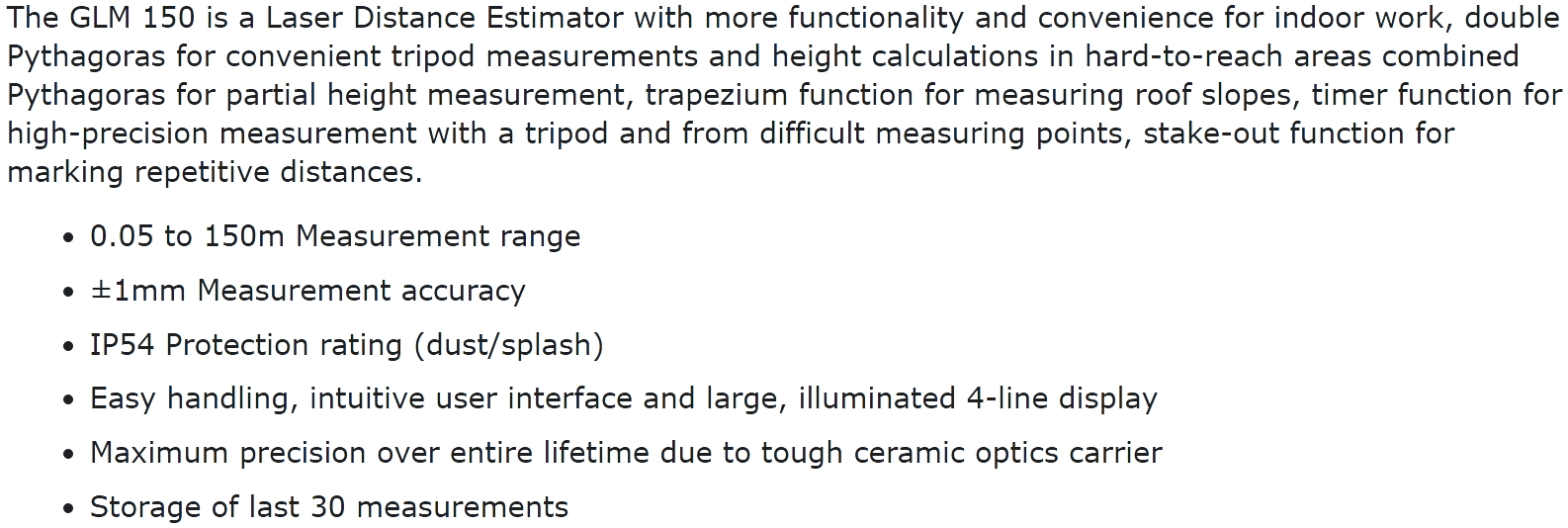 | 3700981 מד טווח לייזר דיגיטלי מקצועי - עד 150 מטר - BOSCH GLM150 | BOSCH | מד טווח לייזר דיגיטלי מקצועי - עד 150 מטר - BOSCH GLM150 ♦ טווח מדידה : 5 ס"מ עד 150 מטר♦ דיוק מד... ציוד בדיקה ומכשירי מדידה » ציוד בדיקה - שונות | לא ניתן להזמין - אזל המלאי |