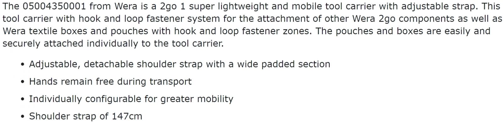 | 2620672 תיק נשיאה מודולרי לכלי עבודה - WERA 2GO TOOL CARRIER | WERA | תיק נשיאה מודולרי לכלי עבודה - WERA 2GO TOOL CARRIER ♦ רצועת כתף מרופדת באורך 147 ס"מ ... ארגזי כלים ופתרונות אחסון » ארגזי כלים , מזוודות טכנאים ותיקים לכלי עבודה | כמות |