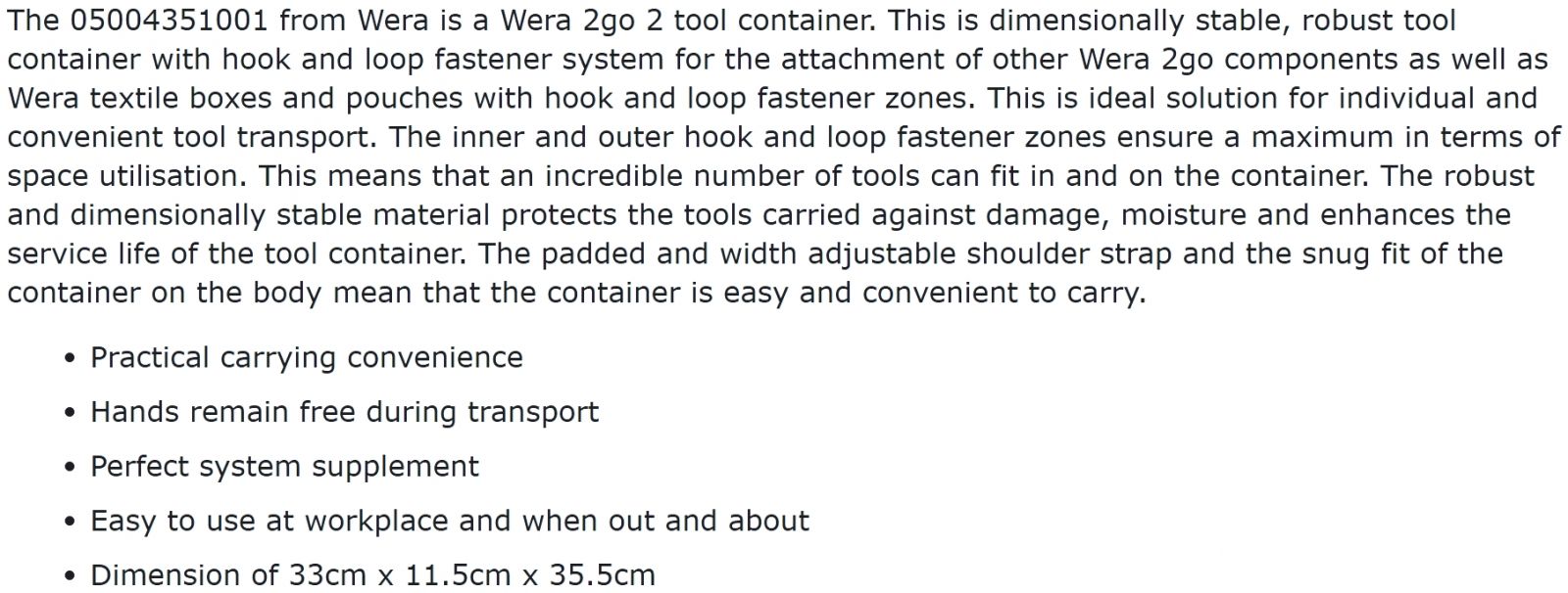 | 3620672 תיק נשיאה מודולרי לכלי עבודה - WERA 2GO TOOL CONTAINER | WERA | תיק נשיאה מודולרי לכלי עבודה - WERA 2GO TOOL CONTAINER ♦ רצועת כתף מרופדת באורך 147 ס"מ♦ מדיות כל... ארגזי כלים ופתרונות אחסון » ארגזי כלים , מזוודות טכנאים ותיקים לכלי עבודה | כמות |