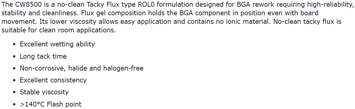 | 8189681 משחת הלחמה לרכיבי (CHEMTRONICS CW8500 - BGA ׁ(NO CLEAN | CHEMTRONICS | משחת הלחמה לרכיבי (CHEMTRONICS CW8500 - BGA ׁ(NO CLEAN ♦ פורמולת ROL0 יחודית לעבודות RE-WORK לרכיבי... מלחמים ותחנות הלחמה » בדיל וחומרי הלחמה לאלקטרוניקה | כמות |