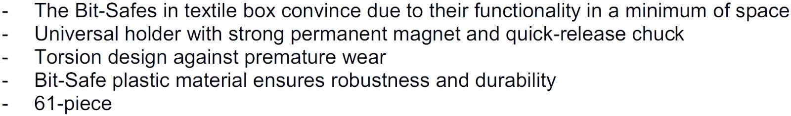 | 0956672 סט ביטים מקצועי - 61 יחידות - WERA BIT SAFE 61 UNIVERSAL 1 | WERA | סט ביטים מקצועי - 61 יחידות - WERA BIT SAFE 61 UNIVERSAL 1 ♦ טכנולוגית BITORTION לאריכות חיי הביטים&dia... כלי עבודה נטענים / חשמליים » מקדחים / ביטים / כרסמים | כמות |
