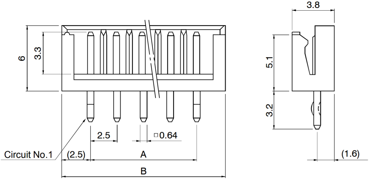 מחבר JST להלחמה למעגל מודפס - סדרת EH - זכר 5 מגעים