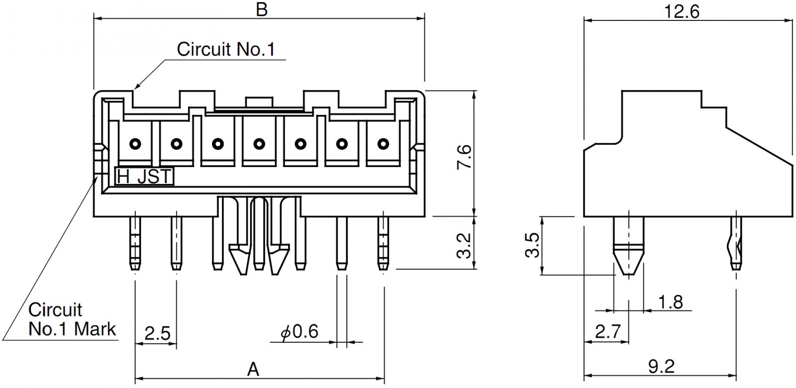 מחבר JST להלחמה למעגל מודפס - סדרת XA - זכר 6 מגעים