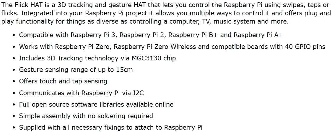 | 4417862 כרטיס הרחבה FLICK HAT עבור RASPBERRY PI 3 | PI SUPPLY | כרטיס הרחבה FLICK HAT עבור RASPBERRY PI 3 ♦ טכנולוגיית 3D TRACKING♦ חיישן תנועה עם רגישות עד 15 ס... מוצרי פיתוח לאלקטרוניקה » מוצרי פיתוח לאלקטרוניקה - RASPBERRY PI | כמות |
