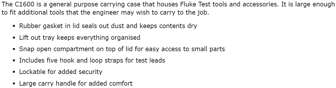 | 4227194 ארגז נייד לאחסון מכשירי מדידה פלוק - FLUKE C1600 | FLUKE | ארגז נייד לאחסון מכשירי מדידה פלוק - FLUKE C1600 ♦ עשוי מיציקת פלסטיק חזקה ועמידה♦ מתאי... ציוד בדיקה ומכשירי מדידה » רבי מודדים וצבתות זרם | כמות |