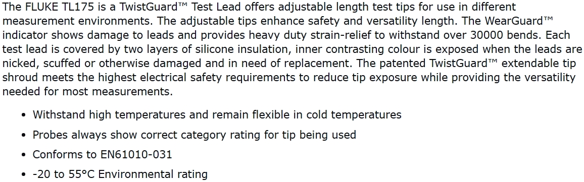 | 1592252 כבלים לרב מודד פלוק - FLUKE TL175 | FLUKE | כבלים לרב מודד פלוק - FLUKE TL175 ♦ מתח בדיקה מקסימלי : 1000V♦ זרם בדיקה מקסימלי : 10A... ציוד בדיקה ומכשירי מדידה » רבי מודדים וצבתות זרם | כמות |