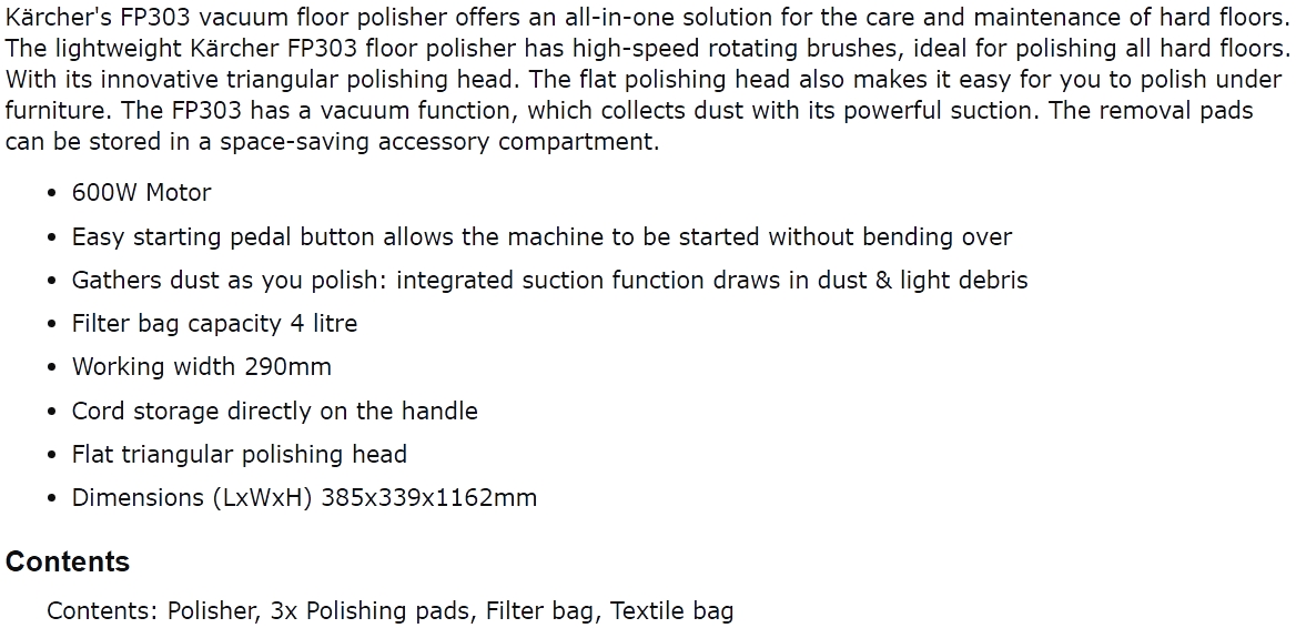 | 06771IS מכונת פוליש שואבת - KARCHER FP 303 | KARCHER | מכונת פוליש שואבת - KARCHER FP 303 ♦ מנוע עוצמתי בהספק של 600 וואט♦ מהירות סיבוב : 1000 ... כלי עבודה נטענים / חשמליים » שואבי אבק ומכונות טיאוט | לא ניתן להזמין - אזל המלאי |