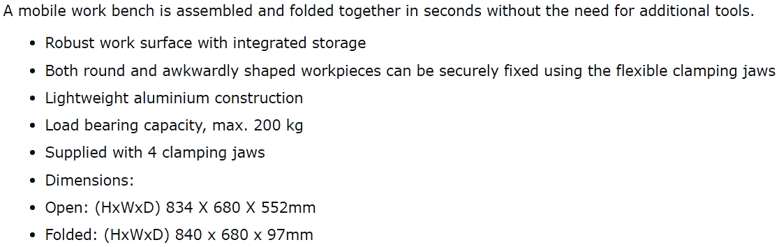 | 98261LT שולחן עבודה מתקפל נייד - BOSCH PWB 600 | BOSCH | שולחן עבודה מתקפל נייד - BOSCH PWB 600 ♦ בסיס אלומיניום עם משטח עבודה חזק ויציב♦ יכולת העמסה גבוה... ארגזי כלים ופתרונות אחסון » שולחנות עבודה , ארונות מדפים וסולמות | כמות |