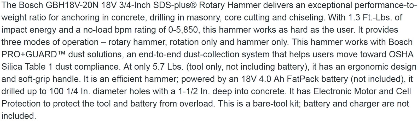 | 1584582 פטישון מקצועי נטען BOSCH GBH 18V-20 - 18V | BOSCH | פטישון מקצועי נטען BOSCH GBH 18V-20 - 18V ♦ מהירות סיבוב : 0-1800 סל''ד♦&nb... כלי עבודה נטענים / חשמליים » מברגות / מקדחות / פטישונים | לא ניתן להזמין - אזל המלאי |