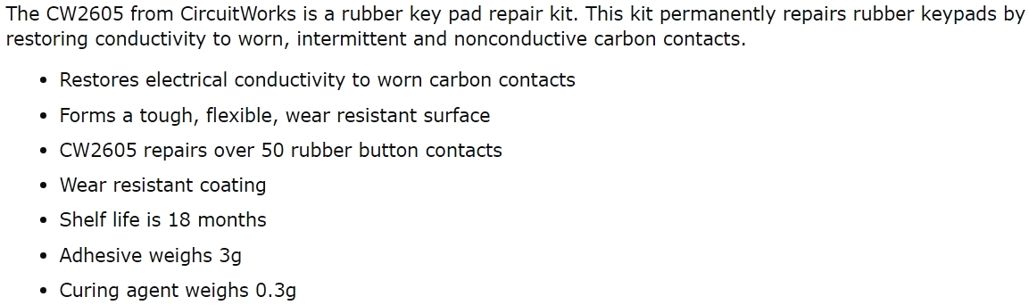 | 097821 קיט לתיקון כפתורי גומי בשלטים - CHEMTRONICS CW2605 | CHEMTRONICS | קיט לתיקון כפתורי גומי בשלטים - CHEMTRONICS CW2605 ♦ משחזר מוליכות חשמלית למגעי פחם♦ מי... מלחמים ותחנות הלחמה » בדיל וחומרי הלחמה לאלקטרוניקה | כמות |