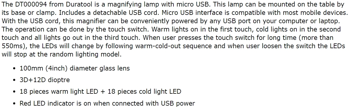 | 4000772 זכוכית מגדלת שולחנית עם תאורה - MICRO USB - הגדלה X3 / X12 | DURATOOL | זכוכית מגדלת שולחנית עם תאורה - MICRO USB - הגדלה X3 / X12 ♦ עדשת זכוכית אספירית איכותית בקוטר 100M... זכוכיות מגדלת ומיקרוסקופים » זכוכיות מגדלת | כמות |