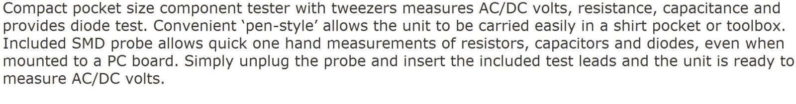 | 1349471 רב מודד פינצטה דיגיטלית - TWEEZER SERIES - 72-8485 | TENMA | רב מודד פינצטה דיגיטלית - TWEEZER SERIES - 72-8485 ... ציוד בדיקה ומכשירי מדידה » רבי מודדים וצבתות זרם | לא ניתן להזמין - אזל המלאי |
