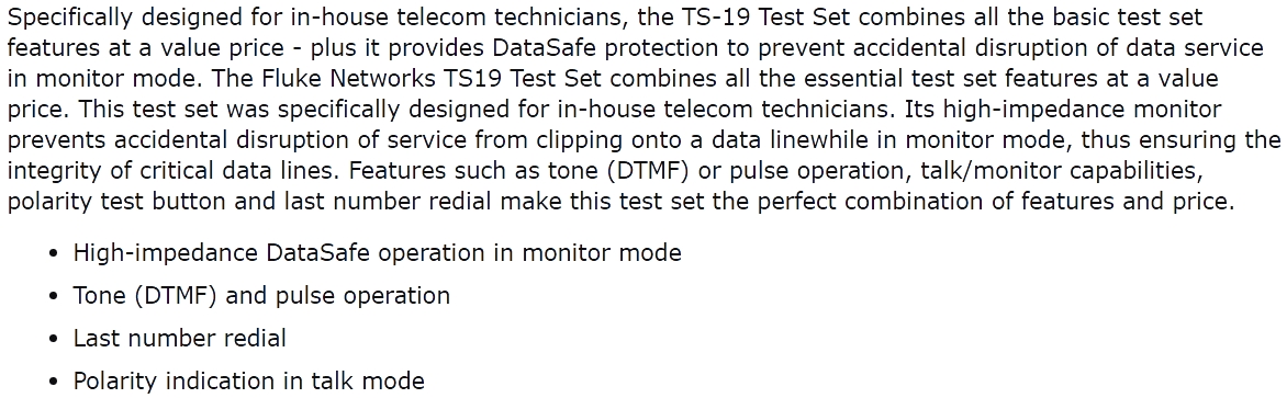 | 1840031 שפופרת לבדיקת קווי טלפון פלוק - FLUKE TS19 | FLUKE NETWORKS | שפופרת לבדיקת קווי טלפון פלוק - FLUKE TS19 &nbs... ציוד בדיקה ומכשירי מדידה » ציוד בדיקה לטכנאי תקשורת | כמות |