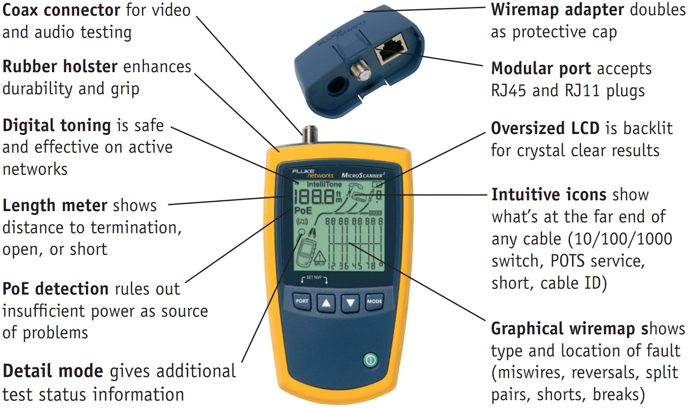 מכשיר לבדיקת כבלי תקשורת פלוק - FLUKE MicroScanner2 - MS2-100 FLUKE NETWORKS ועוד ציוד בדיקה ומכשירי מדידה. לחצו למיפרט טכני מלא. צרו קשר לייעוץ מקצועי: 04-8520233