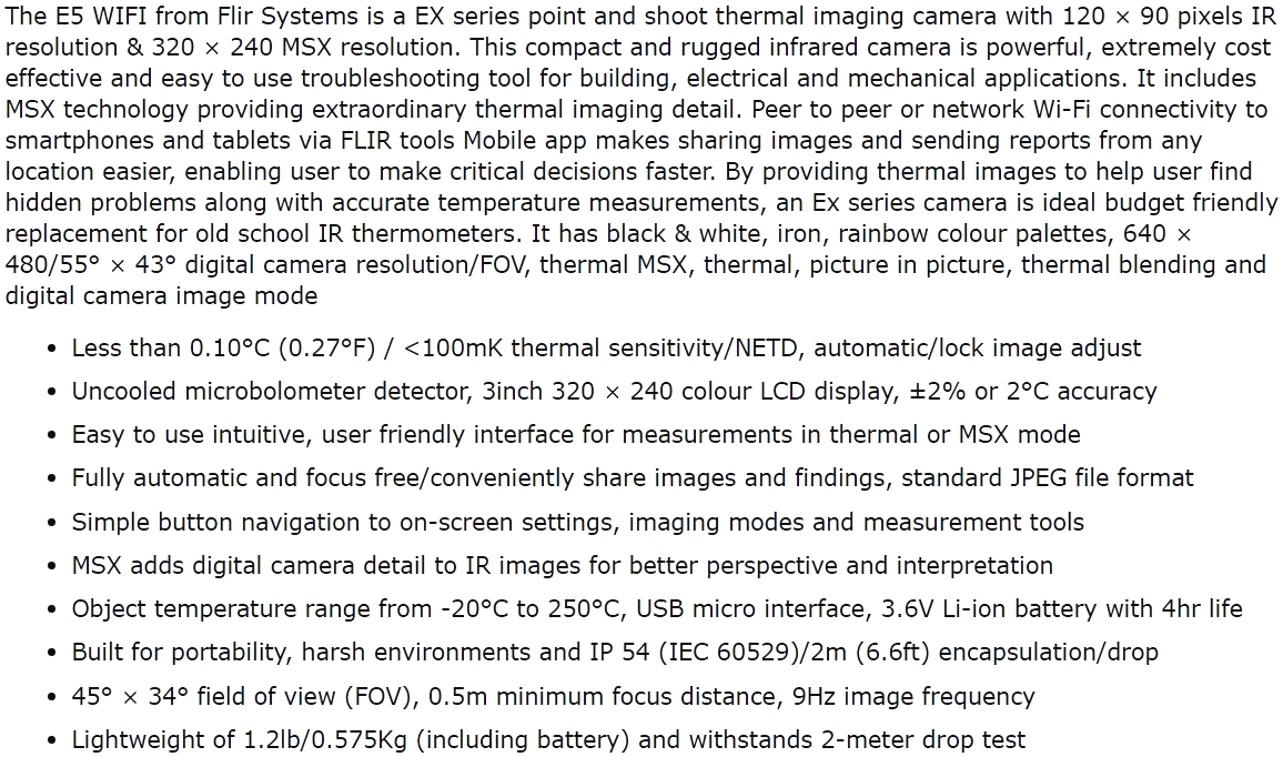 | 5931572 מצלמה תרמית מקצועית - FLIR E5 WIFI | FLIR SYSTEMS | מצלמה תרמית מקצועית - FLIR E5 WIFI ♦ טכנולוגית צילום FLIR MSX BLENDING♦ רזולוציית אינפרא אדום : 1... ציוד בדיקה ומכשירי מדידה » מצלמות תרמיות | לא ניתן להזמין - אזל המלאי |