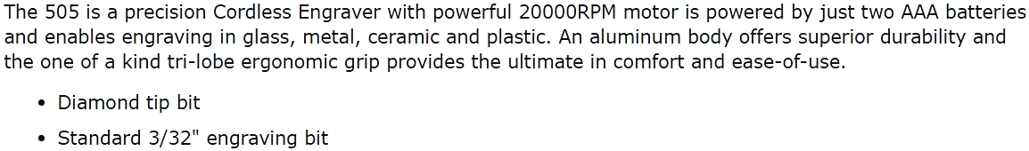 | 0652582 עפרון חריטה מופעל על סוללות - GENERAL TOOLS 505 | GENERAL TOOLS | עפרון חריטה מופעל על סוללות - GENERAL TOOLS 505 ♦ ראש יהלום לחריטה על זכוכית , מתכות , קרמיקה ופלסטיק&d... כלי עבודה נטענים / חשמליים » משחזות ציר ומולטיטולס | כמות |