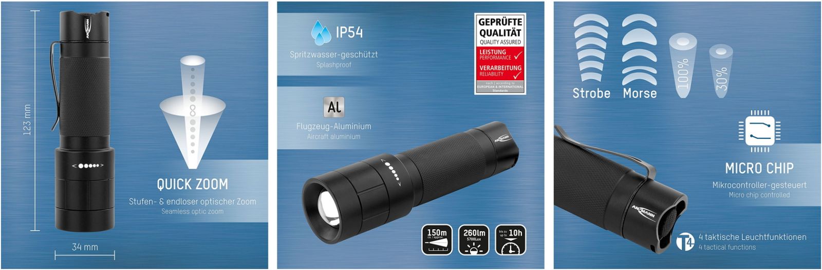פנס ידני מקצועי - ANSMANN PRO M250F - 260 LUMENS