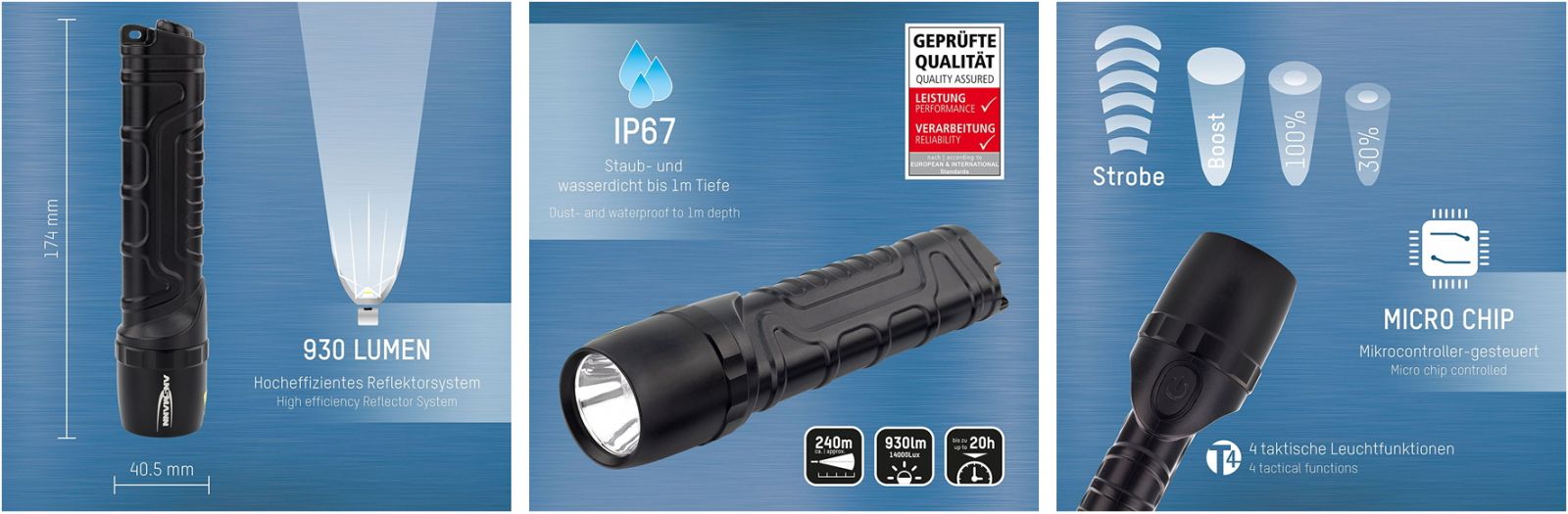 פנס ידני מקצועי - ANSMANN PRO M900P - 930 LUMENS