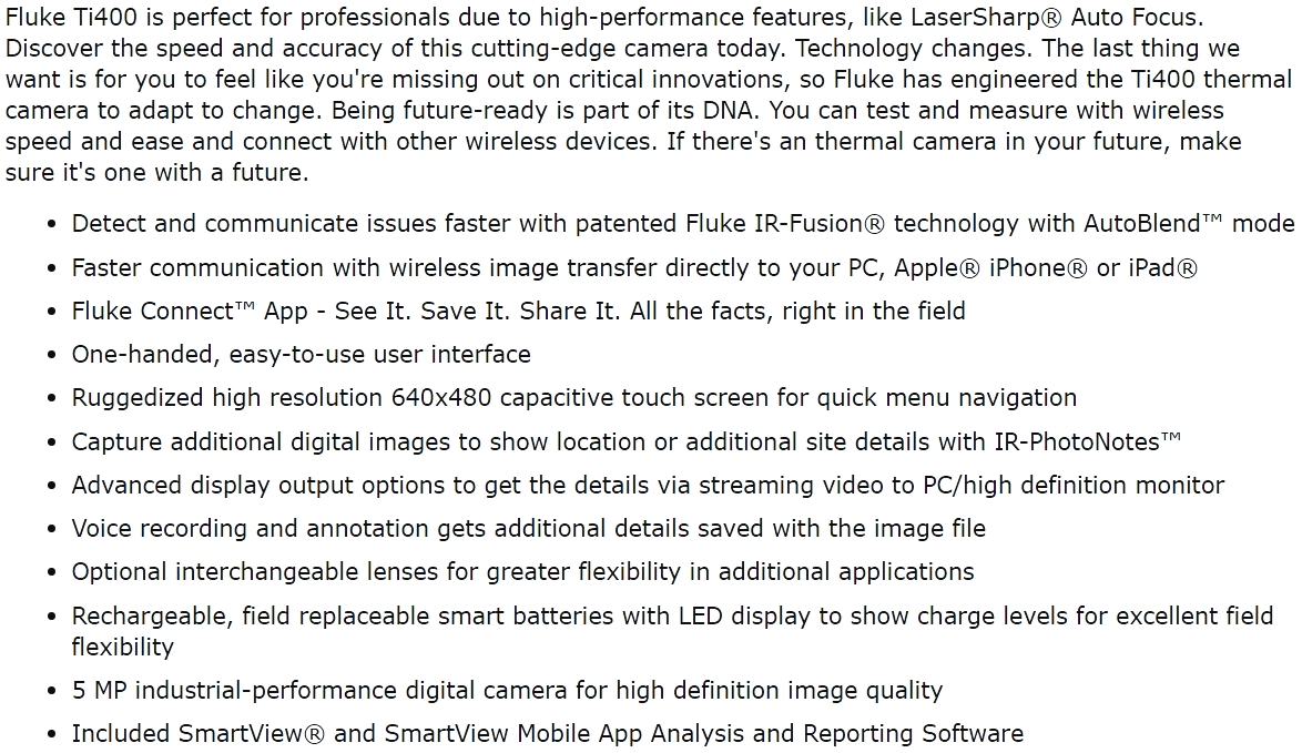 | 9706632 מצלמה תרמית מקצועית פלוק - FLUKE TI400 9HZ | FLUKE | מצלמה תרמית מקצועית פלוק - FLUKE TI400 9HZ ♦ טכנולוגיית צילום LAZER SHARP AUTO FOCUS♦ רז... ציוד בדיקה ומכשירי מדידה » מצלמות תרמיות | לא ניתן להזמין - אזל המלאי |