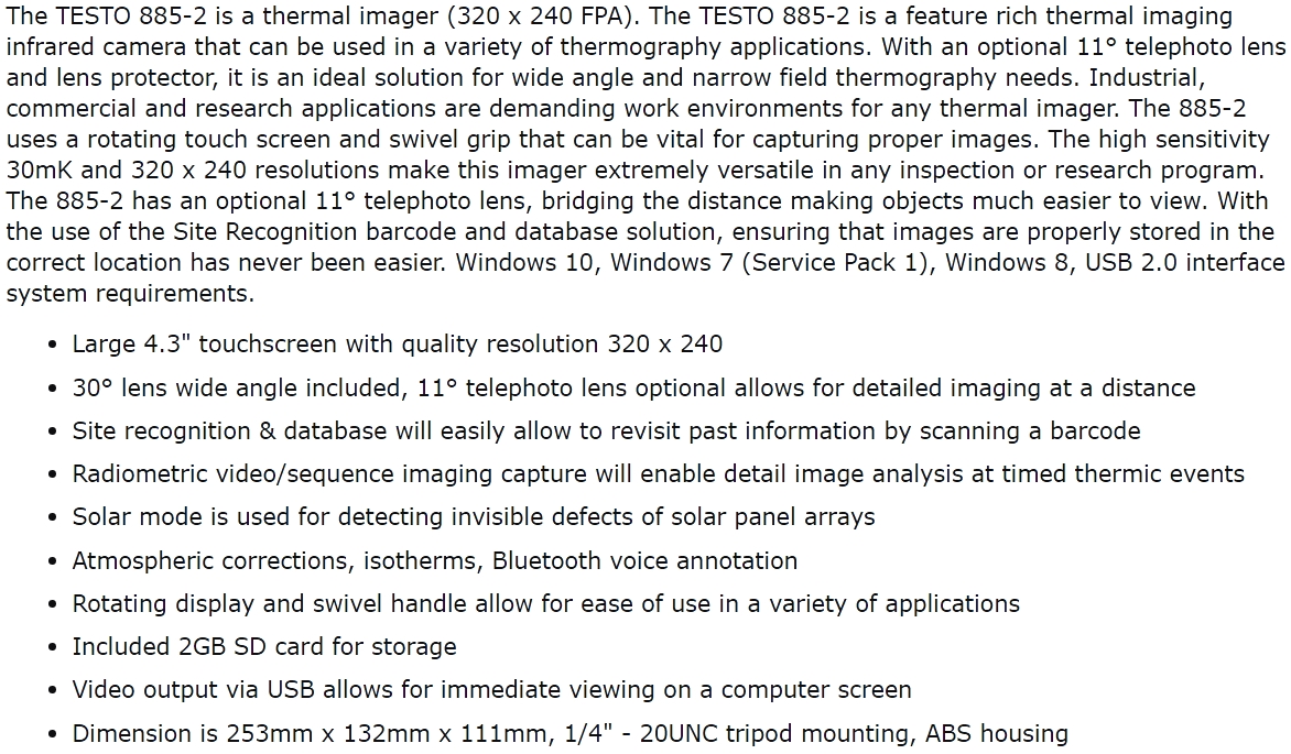 | 5018762 מצלמה תרמית מקצועית - TESTO 885-2 | TESTO | מצלמה תרמית מקצועית - TESTO 885-2 ♦ רזולוציית אינפרא אדום : (320X240 (76800 PIXELS♦ מצב סופר רזול... ציוד בדיקה ומכשירי מדידה » מצלמות תרמיות | כמות |