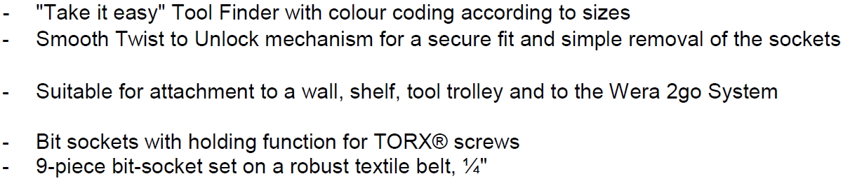 | 5795582 סט ביטים כוכב למפתח ''3/8 - WERA ZYKLOP BELT B 3 | WERA | סט ביטים כוכב למפתח ''3/8 - WERA ZYKLOP BELT B 3 ♦ פלדת כרום ונדיום חזקה ואיכותית♦ סימון צבעוני ו... כלי עבודה נטענים / חשמליים » מקדחים / ביטים / כרסמים | כמות |