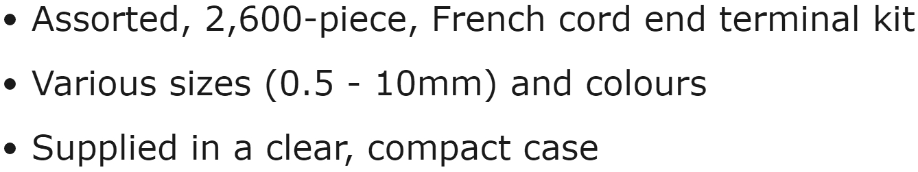 | 1352833 קיט 2600 סופיות מבודדות לכבל - 0.5MM² ~ 10.0MM² | PRO-POWER | קיט 2600 סופיות מבודדות לכבל - 0.5MM² ~ 10.0MM² ♦ מגעים מנחושת עם ציפוי בדיל♦ ... קונקטורים, מחברים ומתאמים » נעלי כבל , סופיות ומחברים לחיבור חוטים | כמות |