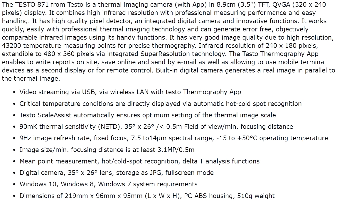 | 0240772 מצלמה תרמית מקצועית - TESTO 871 | TESTO | מצלמה תרמית מקצועית - TESTO 871 ♦ רזולוציית אינפרא אדום : (240X180 (43200 PIXELS♦ מצב סופר רזולוצ... ציוד בדיקה ומכשירי מדידה » מצלמות תרמיות | לא ניתן להזמין - אזל המלאי |