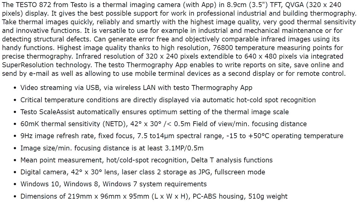 | 1240772 מצלמה תרמית מקצועית - TESTO 872 | TESTO | מצלמה תרמית מקצועית - TESTO 872 ♦ רזולוציית אינפרא אדום : (320X240 (76800 PIXELS♦ מצב סופר רזולוצ... ציוד בדיקה ומכשירי מדידה » מצלמות תרמיות | לא ניתן להזמין - אזל המלאי |