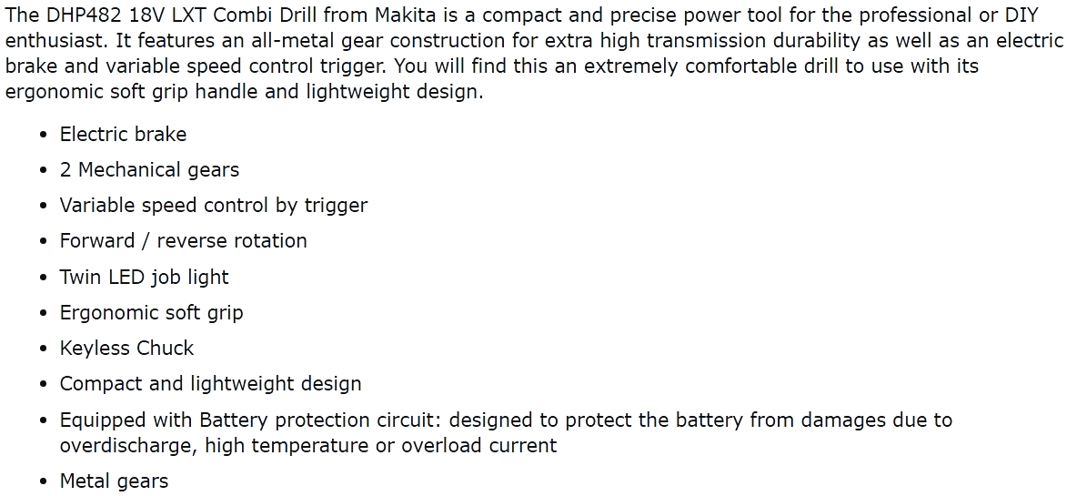 | 53991LT מברגה / מקדחה דופקת מקצועית נטענת MAKITA DHP482M1JW - 18V | MAKITA | מברגה / מקדחה דופקת מקצועית נטענת MAKITA DHP482M1JW - 18V ♦ מתח עבודה : 18V♦ שתי מהירויו... כלי עבודה נטענים / חשמליים » מברגות / מקדחות / פטישונים | לא ניתן להזמין - אזל המלאי |