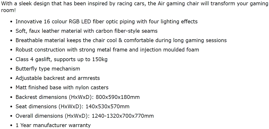 | 10023SC כסא לגיימרים - AEROCOOL AC120 AIR , BLACK / RGB LED | AEROCOOL | כסא לגיימרים - AEROCOOL AC120 AIR , BLACK / RGB LED ♦ יש לחבר למקור מתח 5V בשביל להפעיל את התאורה (USB AD... Talmir Home Tech » כסאות לגיימרים - AK RACING / AEROCOOL | לא ניתן להזמין - אזל המלאי |