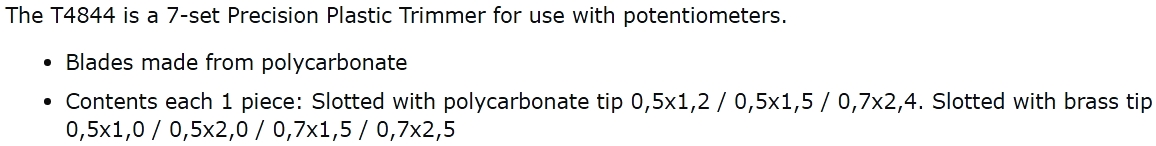 | 3635271 סט מברגים פלסטיים לאלקטרוניקה - CK TOOLS T4844 | CK TOOLS | סט מברגים פלסטיים לאלקטרוניקה - CK TOOLS T4844 ♦ ראש עשוי מפוליקרבונט♦ מותאם לעבודות בסביבה אנטי-... כלי עבודה ידניים » מברגים לאלקטרוניקה , חשמל וסטים | כמות |