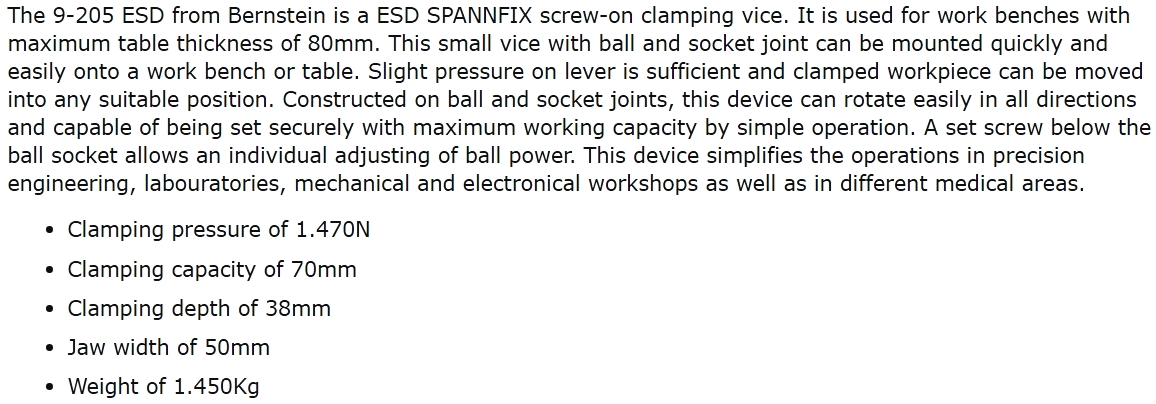 | 2884281 מלחציים כדוריות לשולחן אנטי סטטיות - BERNSTEIN 9-205 ESD | BERNSTEIN | מלחציים כדוריות לשולחן אנטי סטטיות - BERNSTEIN 9-205 ESD ♦ מותאם לעבודה בסביבה אנטי סטטית ESD♦&nb... כלי עבודה ידניים » מלחציים , קליבות וסדנים | כמות |