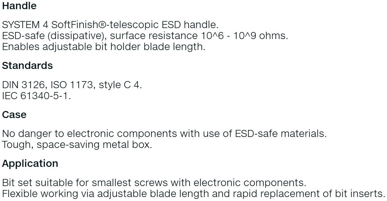 | 8194103 ידית מברג עם סט 14 ביטים - WIHA 33503 SYSTEM 4 ESD | WIHA | ידית מברג עם סט 14 ביטים - WIHA 33503 SYSTEM 4 ESD ♦ מותאם לעבודה בסביבה אנטי סטטית ESD♦ ביטים אי... כלי עבודה ידניים » מברגים לאלקטרוניקה , חשמל וסטים | כמות |