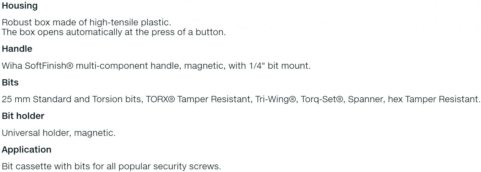 | 5025103 ידית מברג עם סט 25 ביטים - WIHA 09393 | WIHA | ידית מברג עם סט 25 ביטים - WIHA 09393 ♦ ביטים איכותיים מפלדת CHROM VANADIUM♦ ידית ארגונומית מסדרת... כלי עבודה ידניים » מברגים לאלקטרוניקה , חשמל וסטים | כמות |