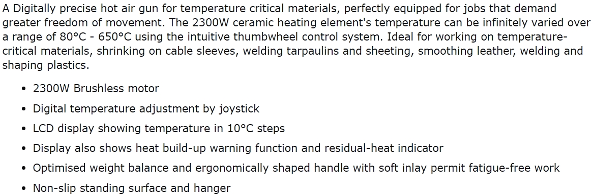 | 6787623 אקדח אוויר חם מקצועי - STEINEL HG 2320 E - צג דיגיטלי | STEINEL | אקדח אוויר חם מקצועי - STEINEL HG 2320 E - צג דיגיטלי תצוגה דיגיטלית, עם ווסות טמפרטורה וויסות אוויר. תח... כלי עבודה נטענים / חשמליים » אקדחי אוויר חם | כמות |