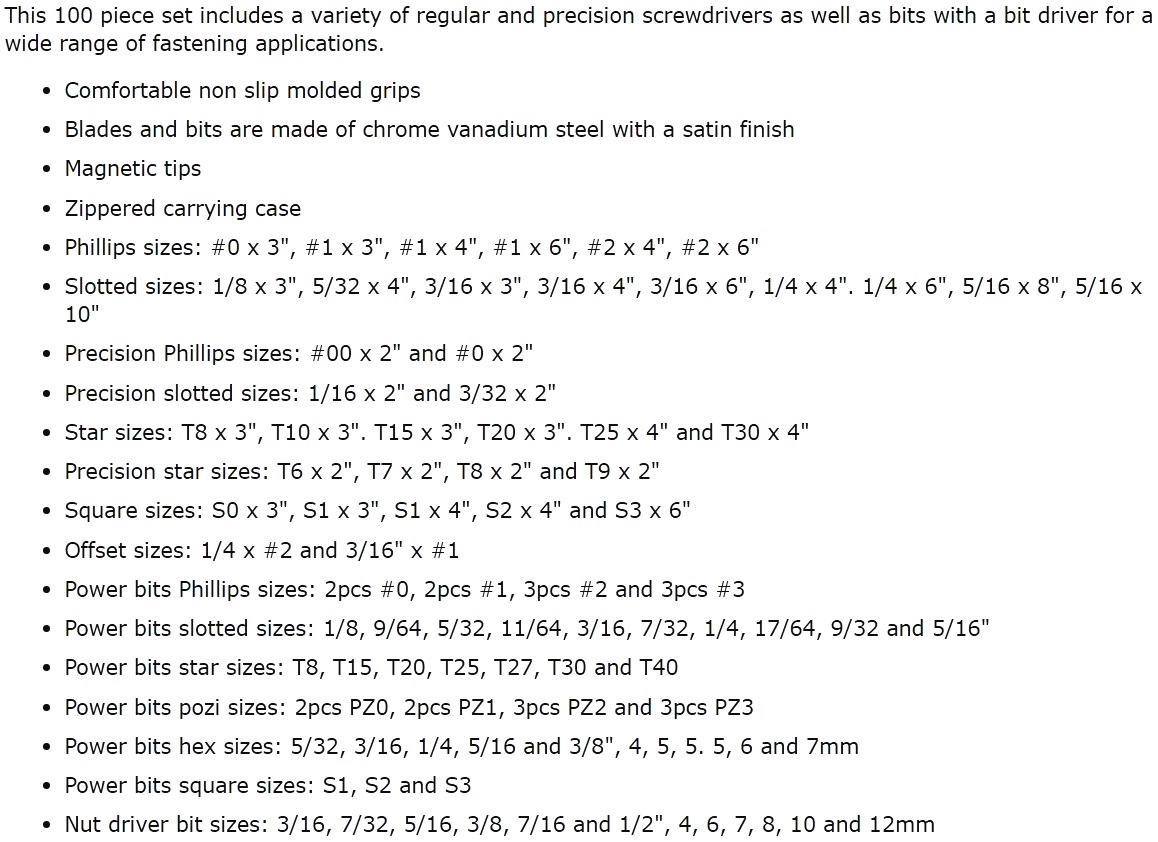 | 4405182 סט מברגים וביטים איכותי - 100 יחידות - PERFORMANCE TOOL W1721 | PERFORMANCE TOOL | סט מברגים וביטים איכותי - 100 יחידות - PERFORMANCE TOOL W1721 ♦ ידית ארגונומית לאחיזה נוחה ויציבה&... כלי עבודה ידניים » מברגים לאלקטרוניקה , חשמל וסטים | כמות |