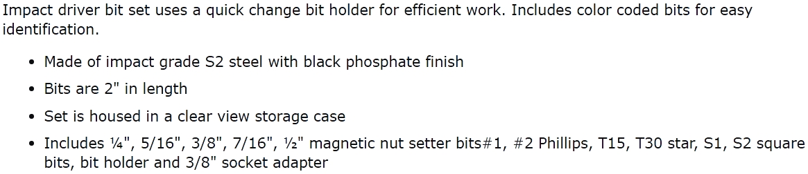 | 8405182 סט ביטים מקצועי למברגות אימפקט - 13 יחידות - PT W9179 | PERFORMANCE TOOL | סט ביטים מקצועי למברגות אימפקט - 13 יחידות - PERFOEMANCE TOOL W9179 ♦ ביטים מפלדה חזקה ואיכותית... כלי עבודה נטענים / חשמליים » מקדחים / ביטים / כרסמים | כמות |