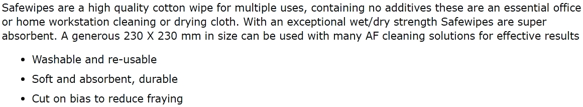 | 920536 מטליות ניקוי מקצועיות - SWI100 - SAFEWIPES | AF INTERNATIONAL | מטליות ניקוי מקצועיות - SWI100 - SAFEWIPES ♦ מטליות מותאמות לשימוש רב-פעמי♦ מידות המטליות : 230MM... דבקים , תרסיסים וכימיקלים » חומרי ניקוי כלליים | כמות |
