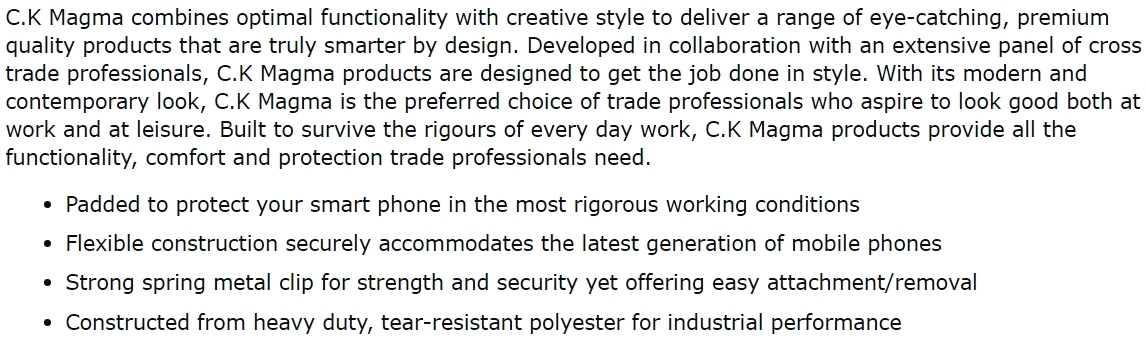 | 9176013 נרתיק לטלפון סלולרי עבור חגורת כלי עבודה - CK MAGMA MA2722 | CK MAGMA | נרתיק לטלפון סלולרי עבור חגורת כלי עבודה - CK MAGMA MA2722 ♦ עשוי מבד פוליאסטר חזק ועמיד♦&nb... ארגזי כלים ופתרונות אחסון » ארגזי כלים , מזוודות טכנאים ותיקים לכלי עבודה | כמות |