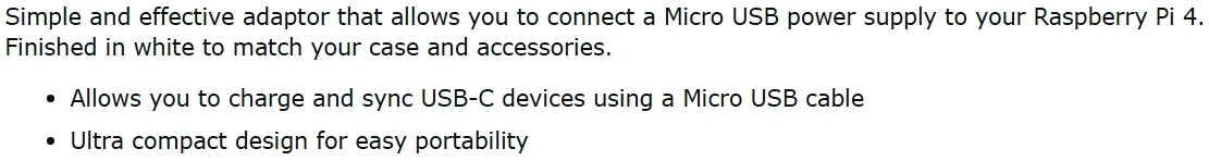 | 1596013 מתאם לבן - MICRO USB TYPE C עבור RASPERRY PI 4 | RASPBERRY PI | מתאם לבן - MICRO USB TYPE C עבור RASPERRY PI 4 ♦ סוג חיבור צד א' : USB TYPE C MALE♦ ... מוצרי פיתוח לאלקטרוניקה » מוצרי פיתוח לאלקטרוניקה - RASPBERRY PI | כמות |