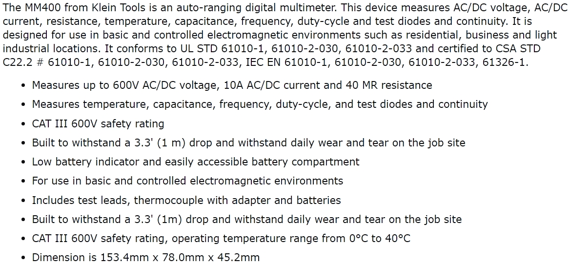 | 9659382 רב מודד ידני דיגיטלי - KLEIN TOOLS MM400 | KLEIN TOOLS | רב מודד ידני דיגיטלי - KLEIN TOOLS MM400 ... ציוד בדיקה ומכשירי מדידה » רבי מודדים וצבתות זרם | לא ניתן להזמין - אזל המלאי |
