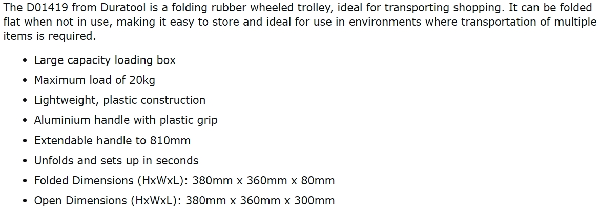 | 6160581 ארגז אחסון טרולי מתקפל - DURATOOL - 380X360X300MM | DURATOOL | ארגז אחסון טרולי מתקפל - DURATOOL - 380X360X300MM ♦ תא אחסון גדול עם יכולת העמסה של עד 20 ק"ג... ארגזי כלים ופתרונות אחסון » פתרונות אחסון ושינוע לרכיבים וכלי עבודה | כמות |
