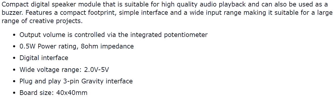 | 0116492 מודול לפיתוח - DFROBOT SPEAKER FOR ARDUINO | DFROBOT | מודול לפיתוח - DFROBOT SPEAKER FOR ARDUINO ♦ מק"ט יצרן : FIT0449 &nb... מוצרי פיתוח לאלקטרוניקה » מוצרי פיתוח לאלקטרוניקה - DFROBOT | כמות |