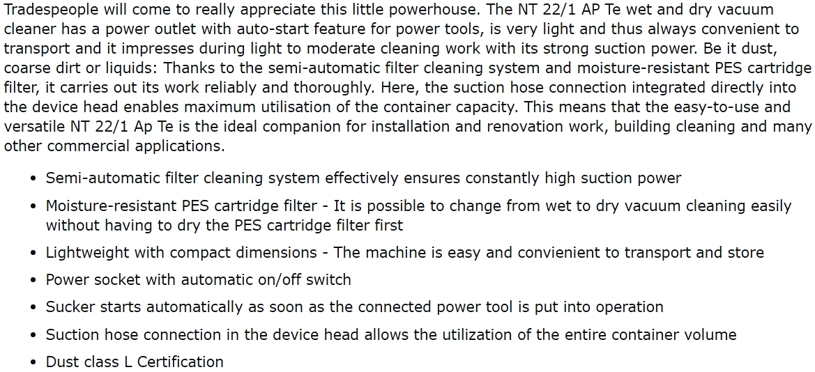 | 96481IS שואב אבק תעשייתי - רטוב / יבש - KARCHER NT 22/1 AP TE | KARCHER | שואב אבק תעשייתי - רטוב / יבש - KARCHER NT 22/1 AP TE - L CLASS ♦ מנוע עוצמתי בהספק של 1350 וו... כלי עבודה נטענים / חשמליים » שואבי אבק ומכונות טיאוט | לא ניתן להזמין - אזל המלאי |