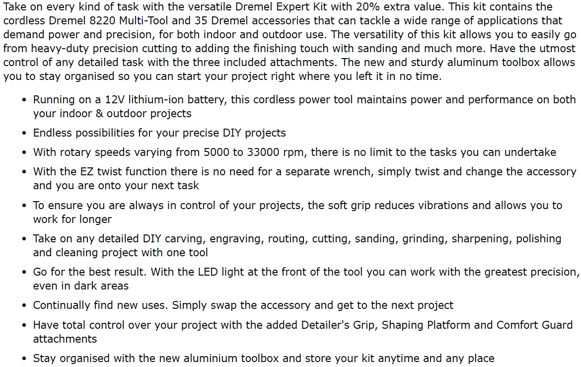 | 1216833 משחזת ציר נטענת 12V - קיט 38 אביזרים - DREMEL 8220 EXPERT KIT | DREMEL | משחזת ציר נטענת 12V - קיט 38 אביזרים - DREMEL 8220 EXPERT KIT ♦ מהירות סיבוב : 5000RPM ~ 33000... כלי עבודה נטענים / חשמליים » משחזות ציר ומולטיטולס | לא ניתן להזמין - אזל המלאי |