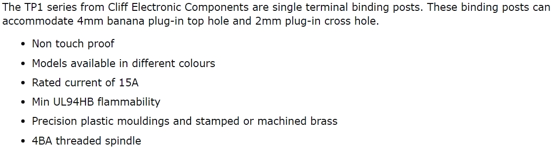 CLIFF ELECTRONIC COMPONENTS TP1 SERIES 4MM PANEL MOUNT BINDING POSTS CLIFF ELECTRONIC COMPONENTS TP1 SERIES 4MM PANEL MOUNT BINDING POSTS