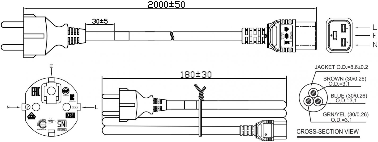 כבל חשמל יצוק - EURO ~ IEC C19 - 16A - 250V - 2M
